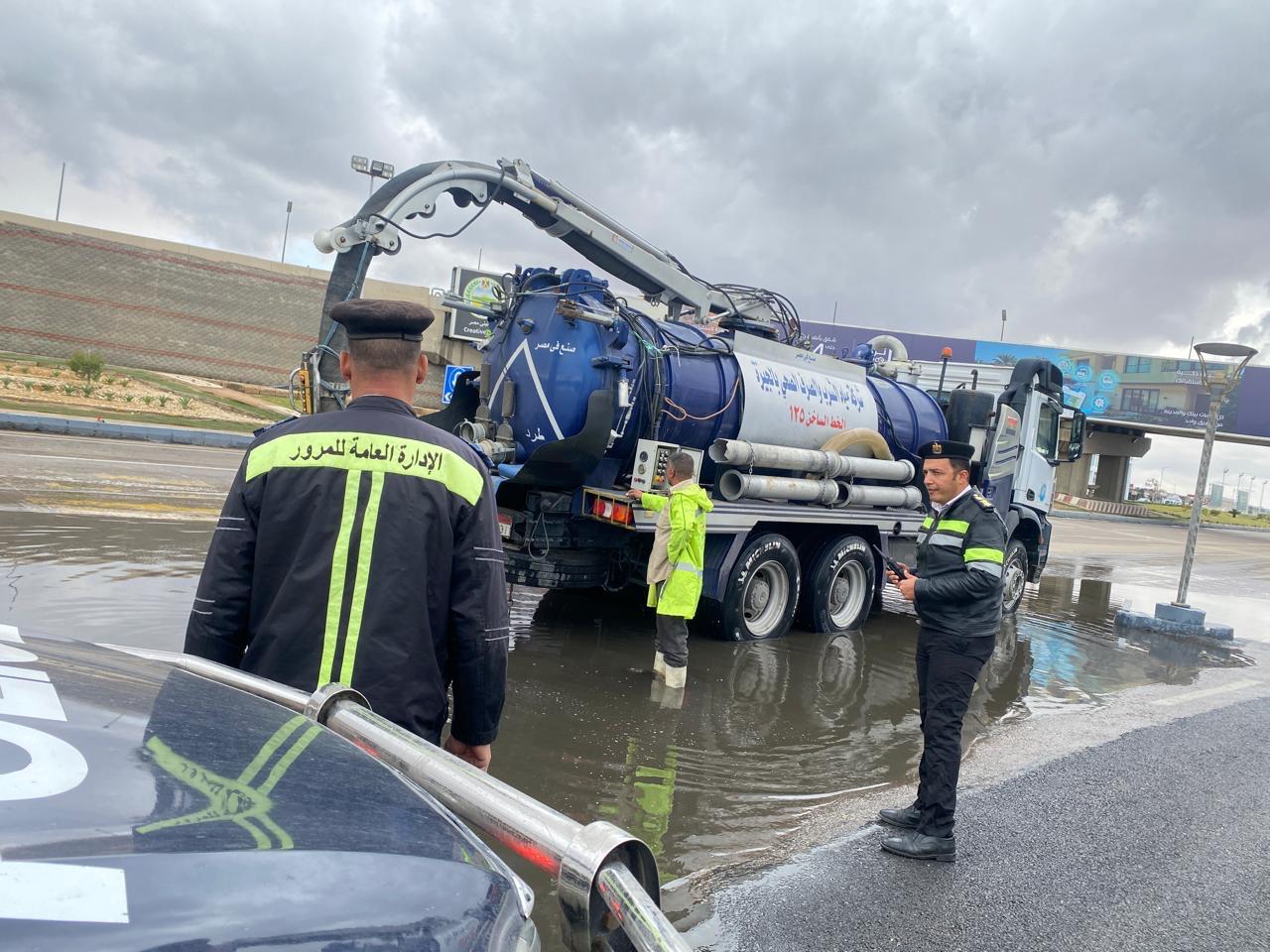 كما تم التنسيق مع الجهات المعنية للدفع بسيارات شفط المياه في أماكن تجمعات الأمطار، لضمان عدم تأثر السيولة المرورية، خاصة بالمناطق الحيوية والطرق السريعة.