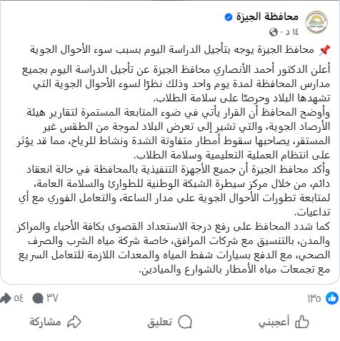 وأكد محافظ الجيزة أن جميع الأجهزة التنفيذية بالمحافظة في حالة انعقاد دائم، من خلال مركز سيطرة الشبكة الوطنية للطوارئ والسلامة العامة، لمتابعة تطورات الأحوال الجوية على مدار الساعة، والتعامل الفوري مع أي تداعيات.