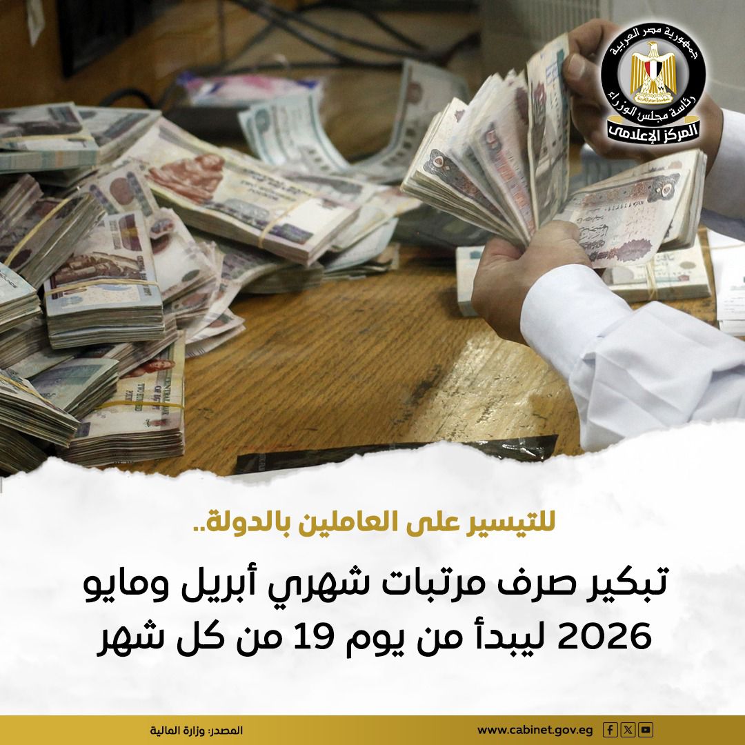 «تبدأ يوم 19».. الحكومة: تبكير صرف مرتبات أبريل ومايو 2026