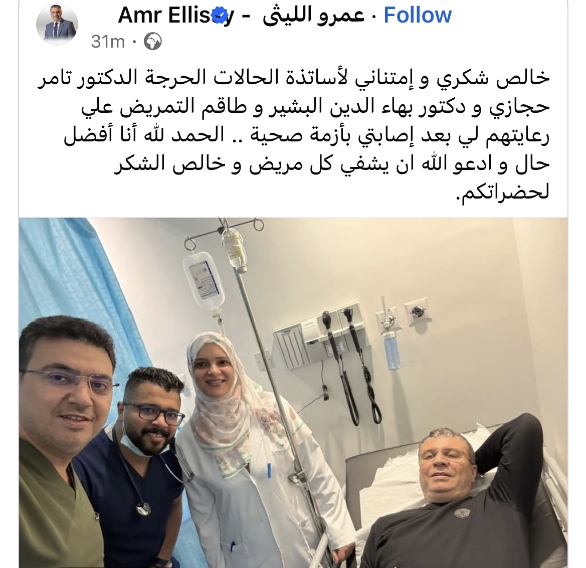 وكتب عمرو الليثي عبر حسابه على موقع التواصل الاجتماعي فيسبوك: "خالص شكري وامتناني لأساتذة الحالات الحرجة الدكتور تامر حجازي والدكتور بهاء الدين البشير وطاقم التمريض على رعايتهم لي بعد إصابتي بأزمة صحية. الحمد لله، أنا أفضل حالًا، وأدعو الله أن يشفي كل مريض، وخالص الشكر لحضراتكم".