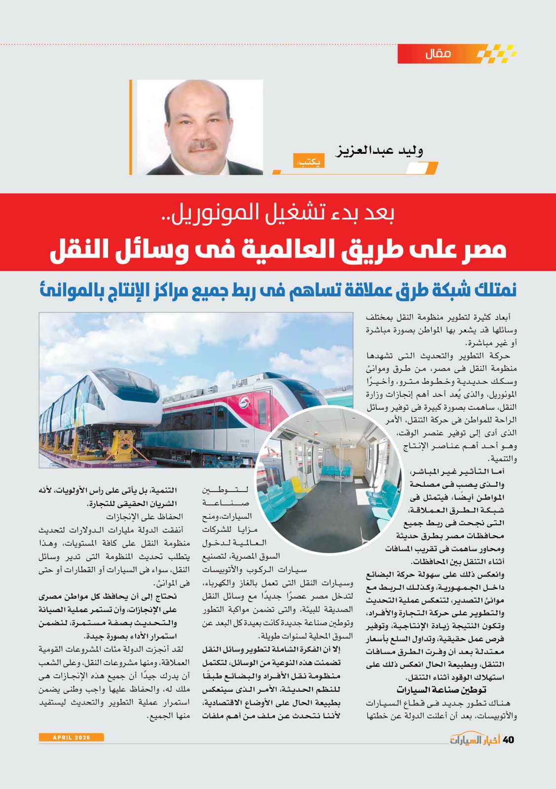 وكتب الكاتب الصحفي وليد عبدالعزيز مقالا بعنوان "مصر على طريق العالمية فى وسائل النقل"، كما كتب الكاتب الصحفي عثمان علام مقالا بعنوان "أسعار السيارات ما بين الانفراجة والارتفاعات".