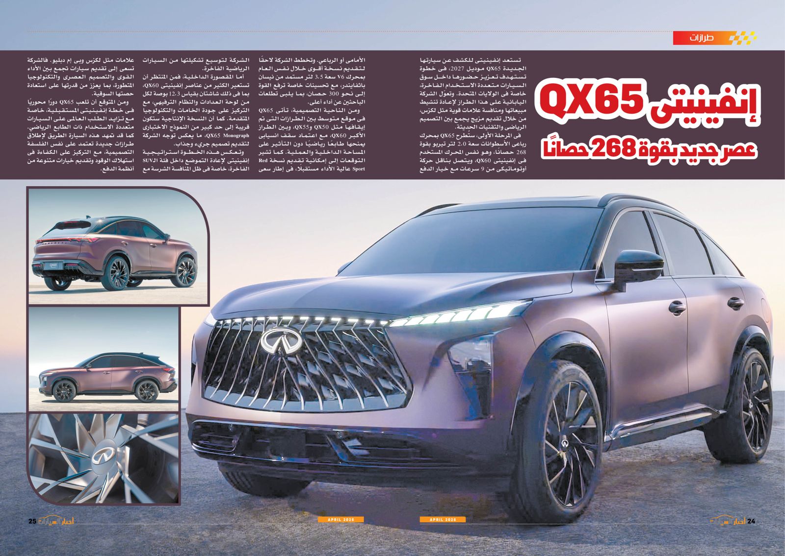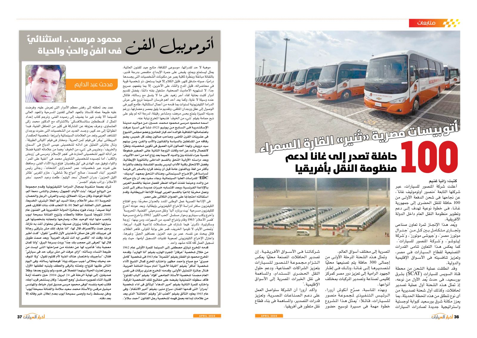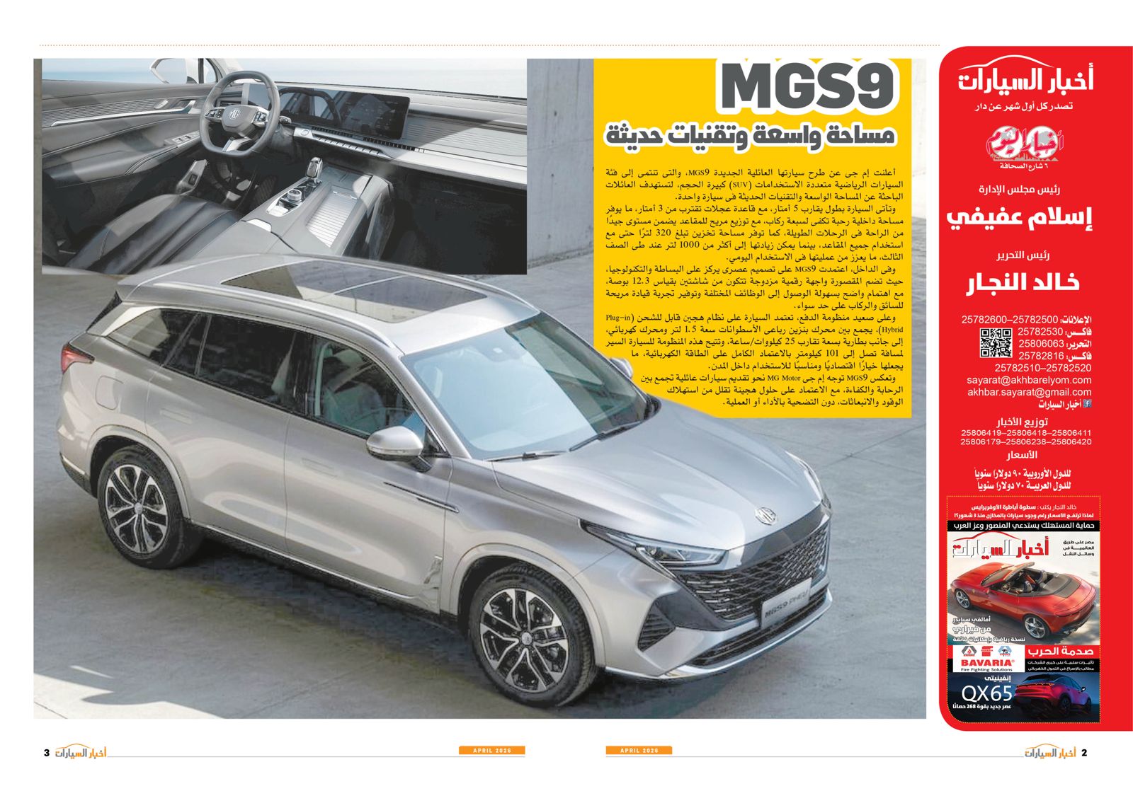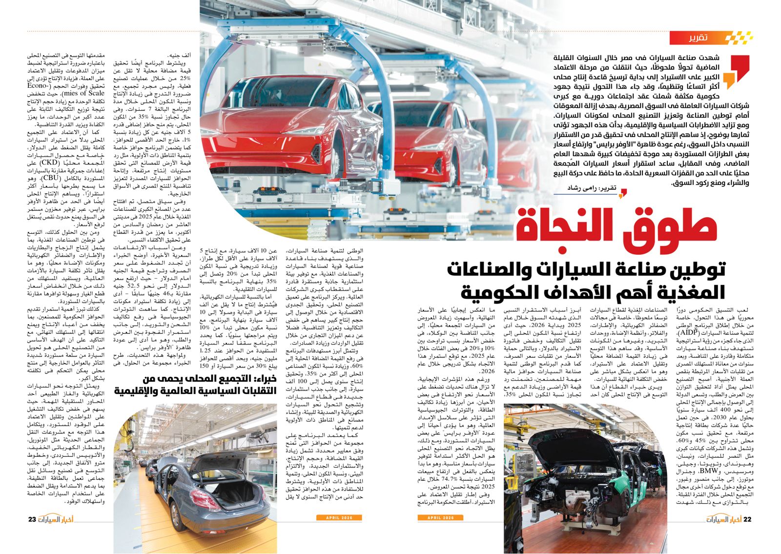 ومن بين التقارير في العدد أيضًا: عودة الأوفر برايس، EV2 من كيا.. حضور كبير في السيارات الكهربائية، توطين صناعة السيارات والصناعات المغذية أهم الأهداف الحكومية، إنفينيتي QX65.. عصر جديد بقوة 268 حصانًا، المستقبل لصناعة السيارات، BYD سونج ألترا.. إضافة كبيرة للسوق الكهربائية، استدعاء المنصور للسيارات وعزب العرب لعيوب تصنيعية، E7X.. قوة كبيرة وابتكار في التفاصيل، صدمة الحرب، أتوبيسات مصرية تنير القارة السمراء، كايين S الكهربائية.. تجربة قيادة مختلفة من بورش، QQ3 من شيري.. سهولة في الحركة وقت الزحام.