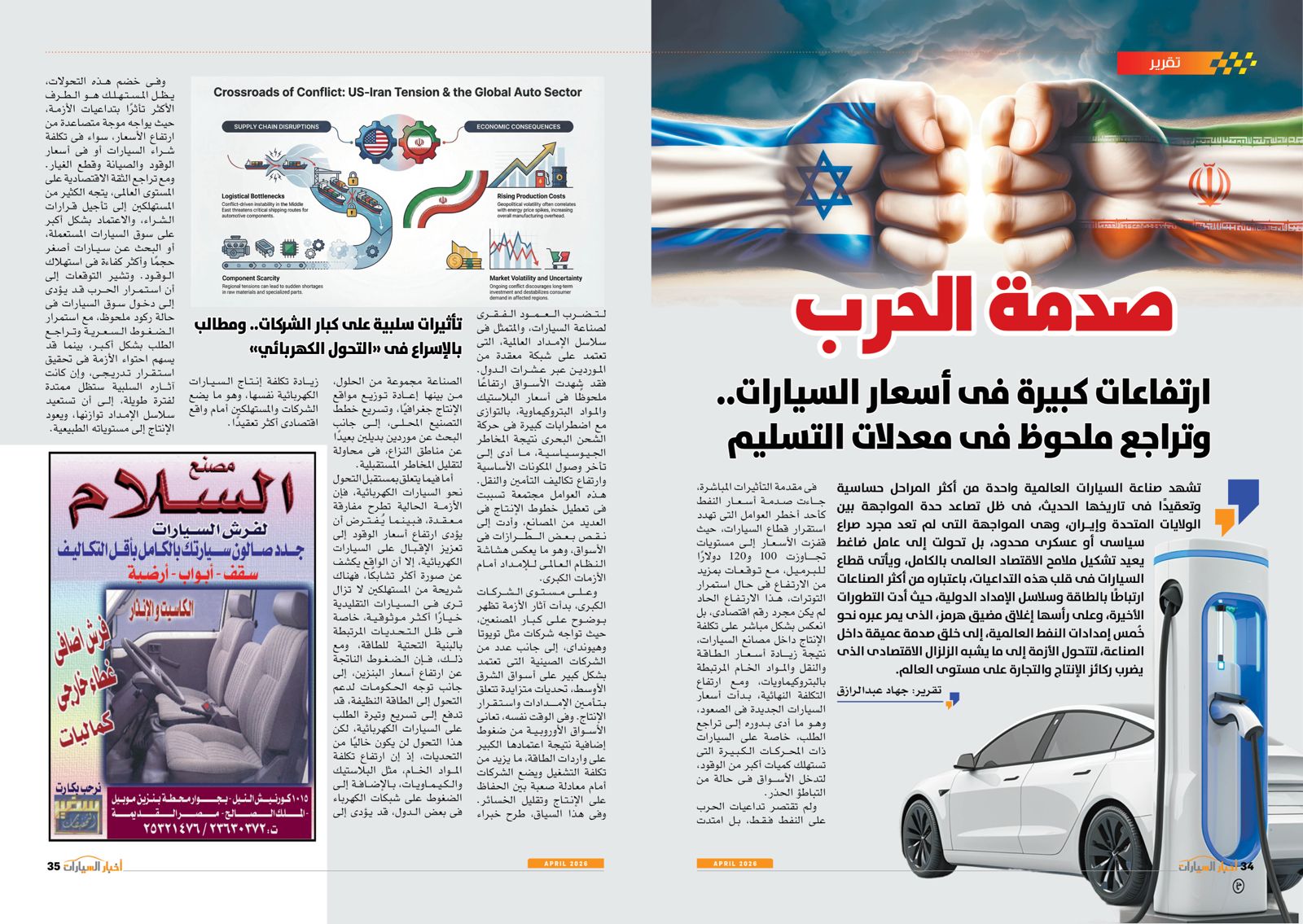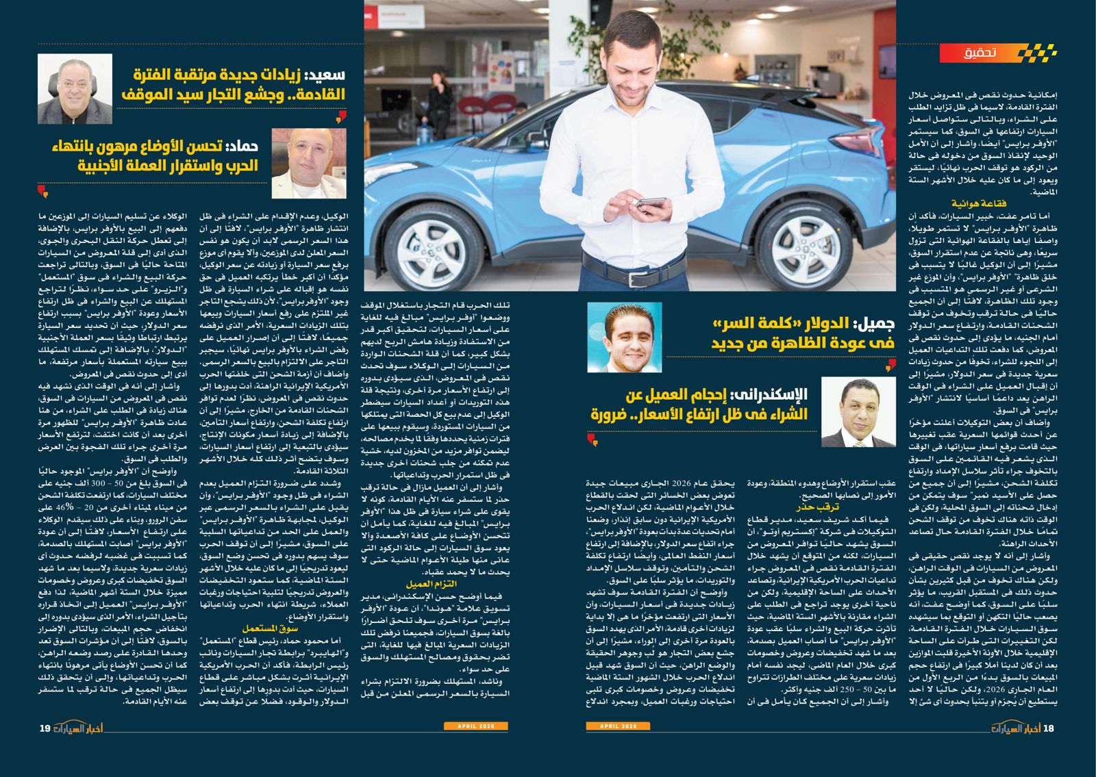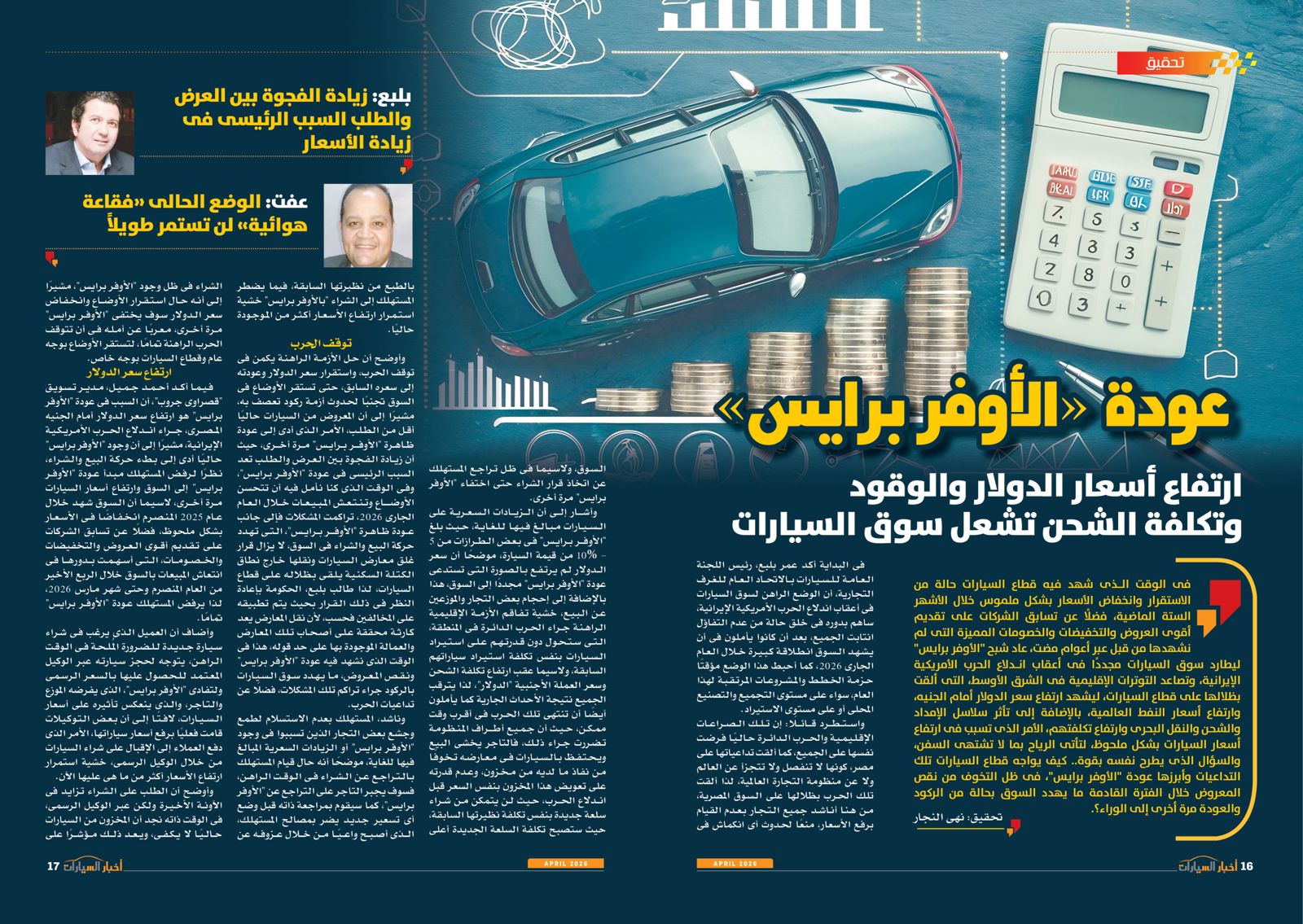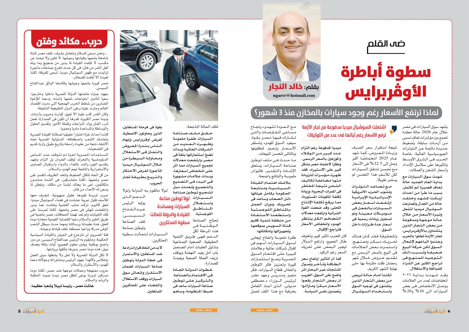 البداية مع مقال الكاتب الصحفي خالد النجار رئيس تحرير مجلة "أخبار السيارات" الذي جاء بعنوان "سطوة أباطرة الأوفربرايس"، حيث قال إن سوق السيارات في مصر يشهد خلال عام 2026 حالة معقدة تجمع بين مؤشرات تعافٍ نسبى من أزمات سابقة، وضغوط جديدة ناتجة عن التوترات الجيوسياسية العالمية، خاصة الحرب في الشرق الأوسط وتأثيرها على سلاسل الإمداد وأسعار الشحن والعملات.