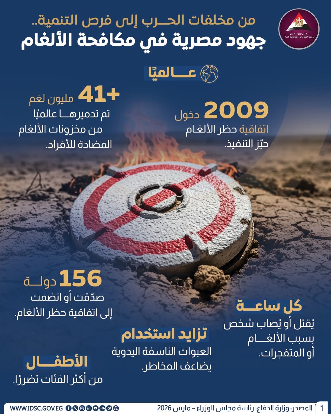 نشر مركز المعلومات ودعم اتخاذ القرار بمجلس الوزراء "إنفوجراف" اليوم السبت، بعنوان "من مخلفات الحرب إلى فرص التنمية.. جهود مصرية في مكافحة الألغام"، استعرض من خلاله أبرز الجهود الوطنية والدولية للتعامل مع خطر الألغام وتعظيم الاستفادة من الأراضي المطهّرة.