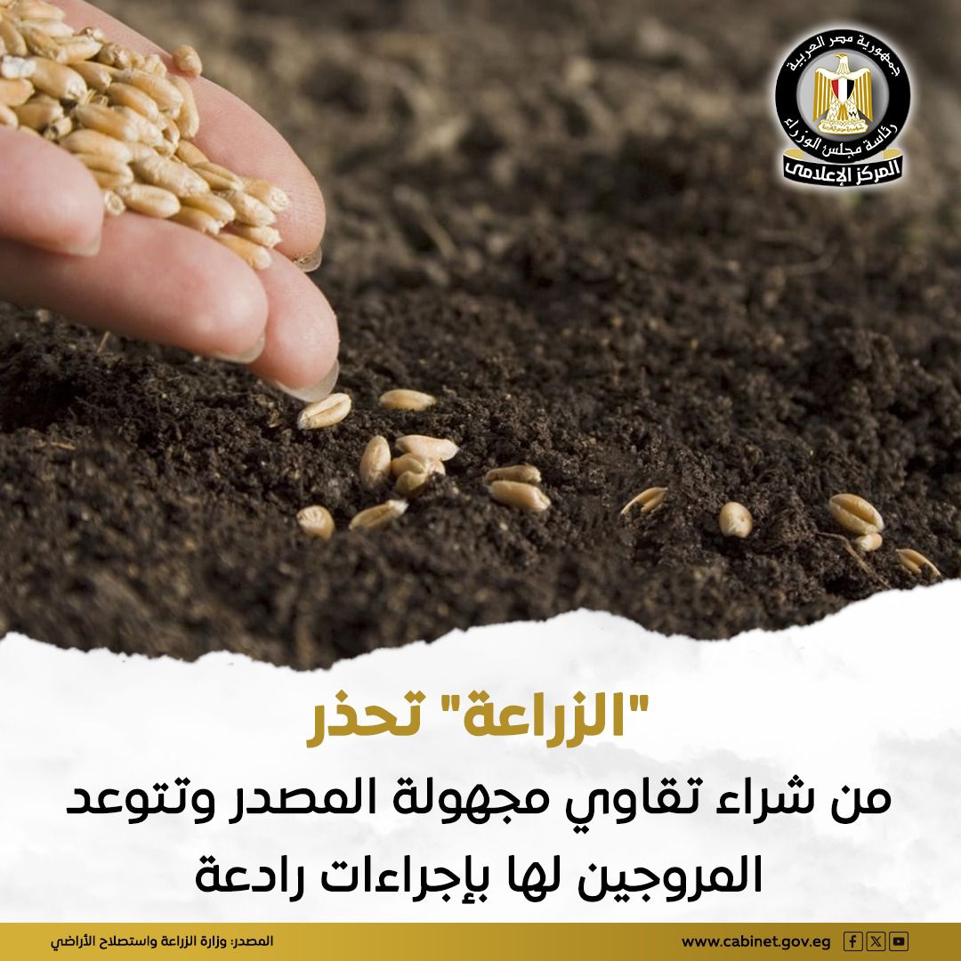 في ضوء ما رصدته وزارة الزراعة واستصلاح الأراضي من انتشار إعلانات ممولة عبر مواقع التواصل الاجتماعي، تروج لما اسمته بـ"أفضل التقاوي العالمية"، وتتضمن أصنافًا غير مسجلة ومجهولة المصدر وعلى سبيل المثال "صنف أرز (سوبر 600) أو قمح (999)" أو أي مسمي مضلل أخر، تؤكد الوزارة أن هذه الإعلانات لا تمت بصلة لها، وتمثل محاولات احتيال من قبل جهات غير معتمدة، تروج لتقاوي غير مسجلة يتم إدخالها بطرق غير شرعية، أو تجميعها محليًا من أصناف محلية واستغلال الإعلان عنها كتقاوي مستوردة.