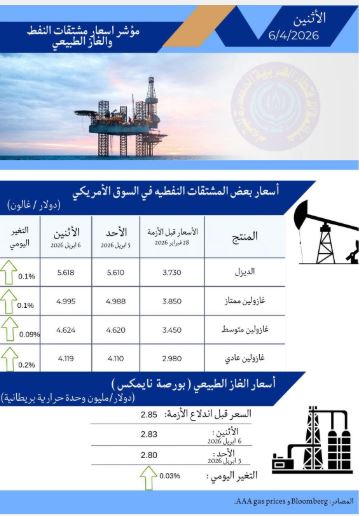 نشرت منظمة الدول العربية المصدرة للبترول، مؤشرات أسعار المشتقات النفطية بالولايات المتحدة الأمريكية وأسعار الغاز الطبيعى اليوم الأثنين 6 أبريل 2026.