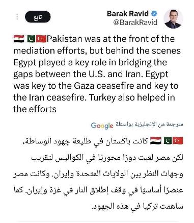 وأوضح رافيد، عبر منصة «إكس»، أن القاهرة كانت عنصرًا أساسيًا في الدفع نحو التهدئة، إلى جانب دورها في وقف إطلاق النار في غزة، لافتًا إلى أن تركيا شاركت أيضًا في هذه الجهود.