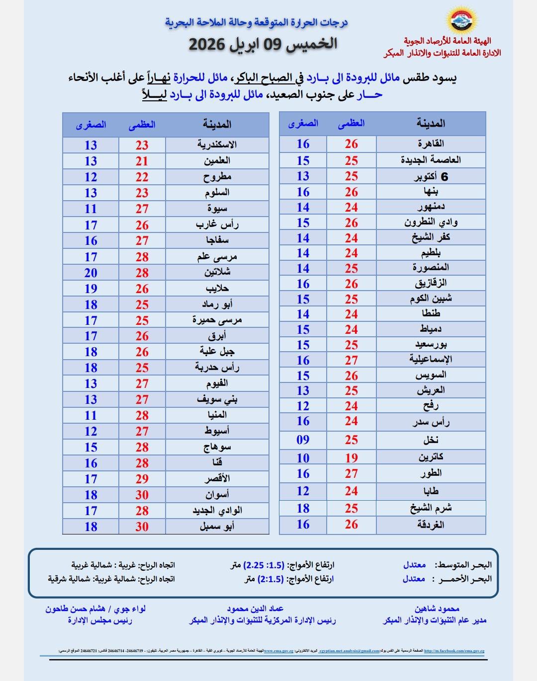 توقعت الهيئة العامة للأرصاد الجوية أن تشهد البلاد غدًا الخميس 9 أبريل 2026 ارتفاعًا تدريجيًا في درجات الحرارة على أغلب الأنحاء، مع طقس مائل للبرودة صباحًا، يتحول إلى مائل للحرارة نهارًا، وحار على مناطق جنوب الصعيد، بينما يعود للبرودة ليلًا.