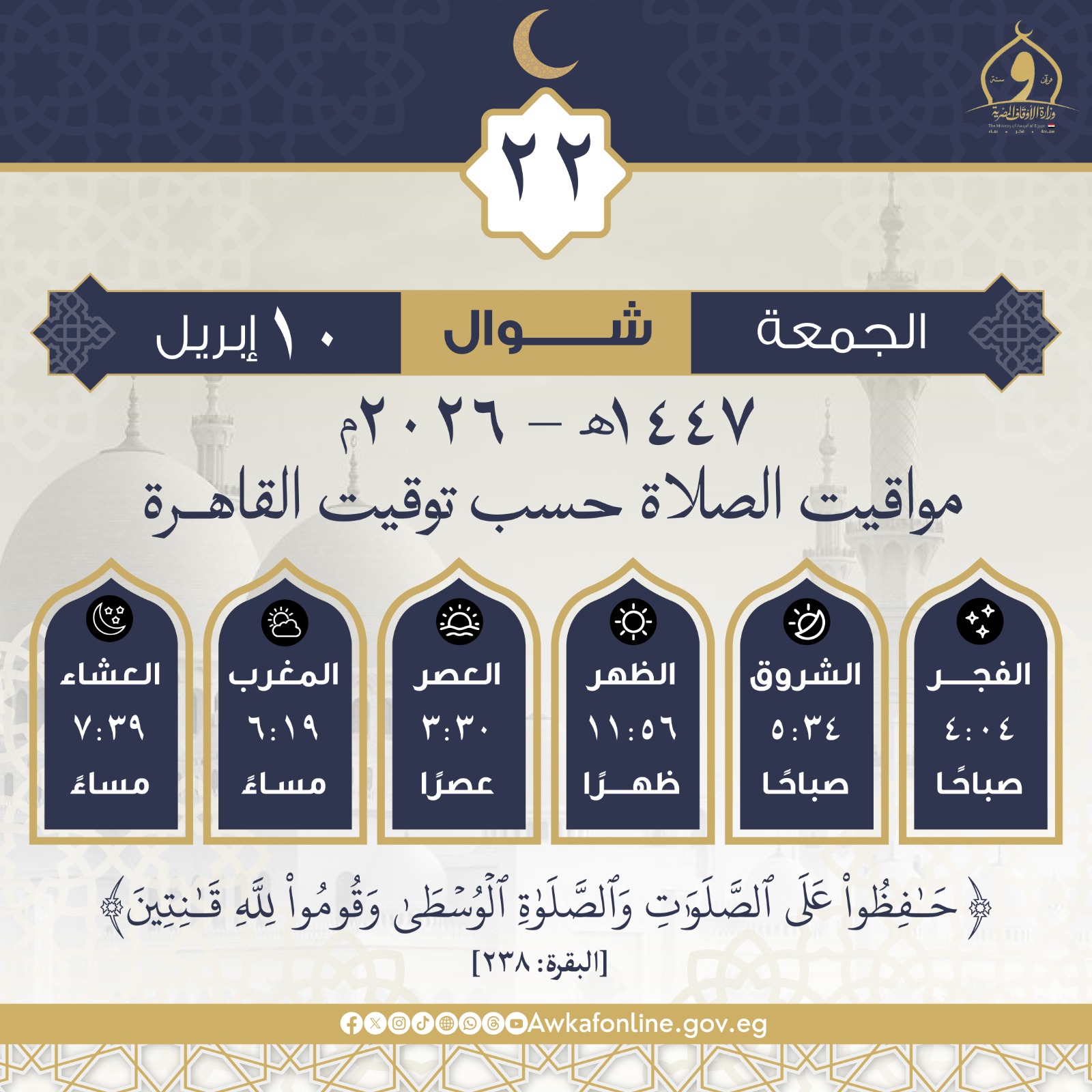 بالتزامن مع الجمعة الرابعة من شهر شوال لعام 1447 هـ، يقدم موقع "مستقبل وطن نيوز" خدمة مميزة لقرائه للتعرف على مواقيت الصلاة في عدد من المحافظات اليوم الجمعة الموافق 10 أبريل 2026.