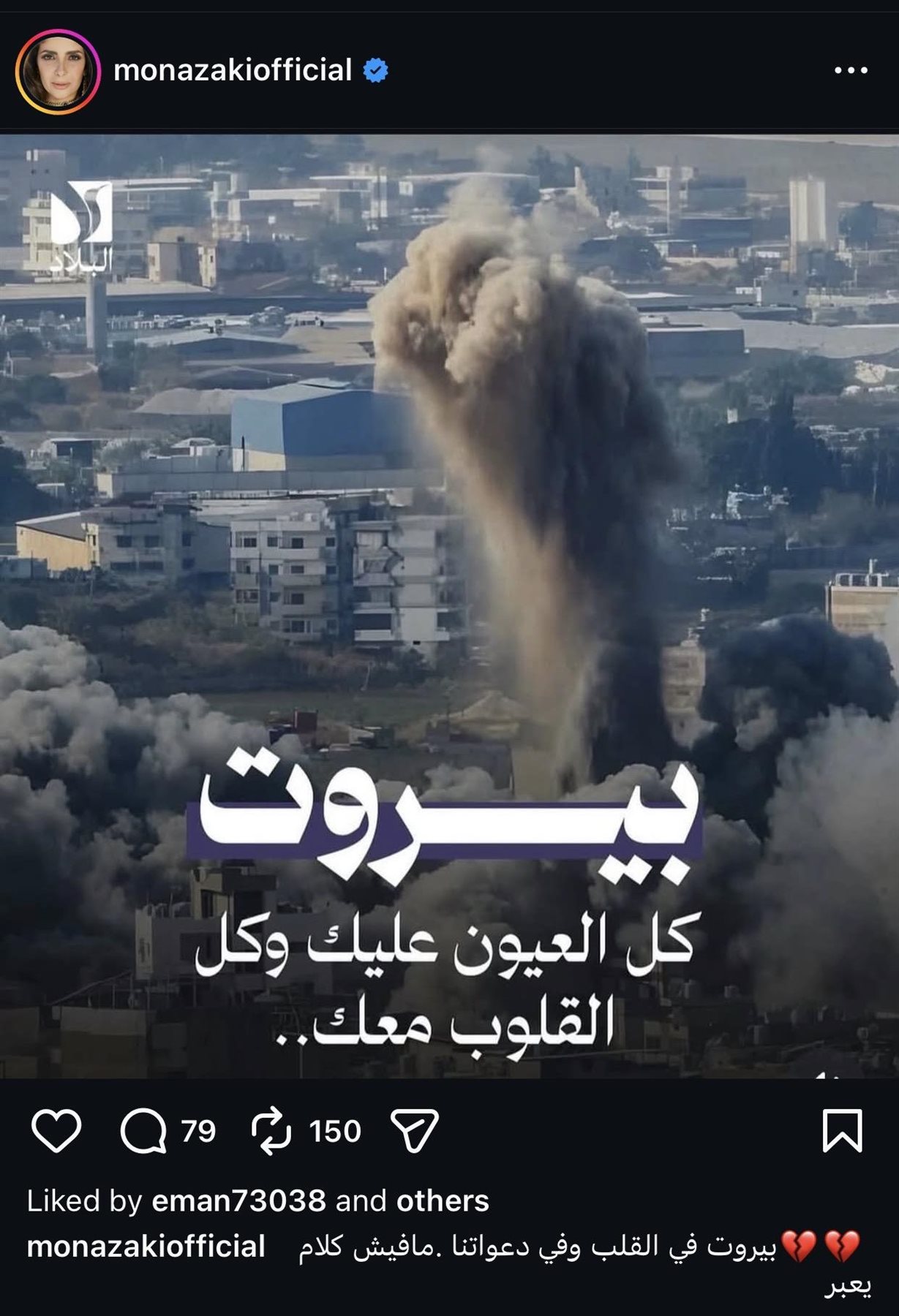 ونشرت الفنانة رسالة مقتضبة حملت مشاعر صادقة، عبّرت من خلالها عن مدى ارتباطها ببيروت، حيث كتبت: "بيروت في القلب وفي دعواتنا.. مفيش كلام يعبر"، في كلمات لاقت تفاعلًا واسعًا من جمهورها عبر منصات التواصل الاجتماعي.