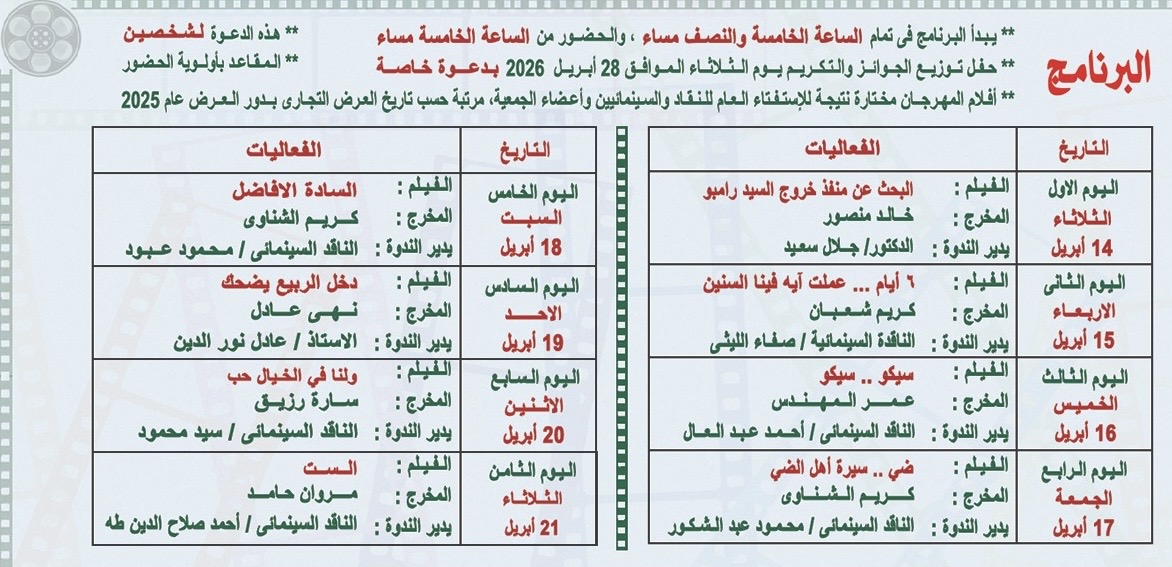 ويختتم المهرجان فعالياته بحفل توزيع الجوائز في 28 أبريل، متضمنا تكريم عدد من رموز السينما المصرية.