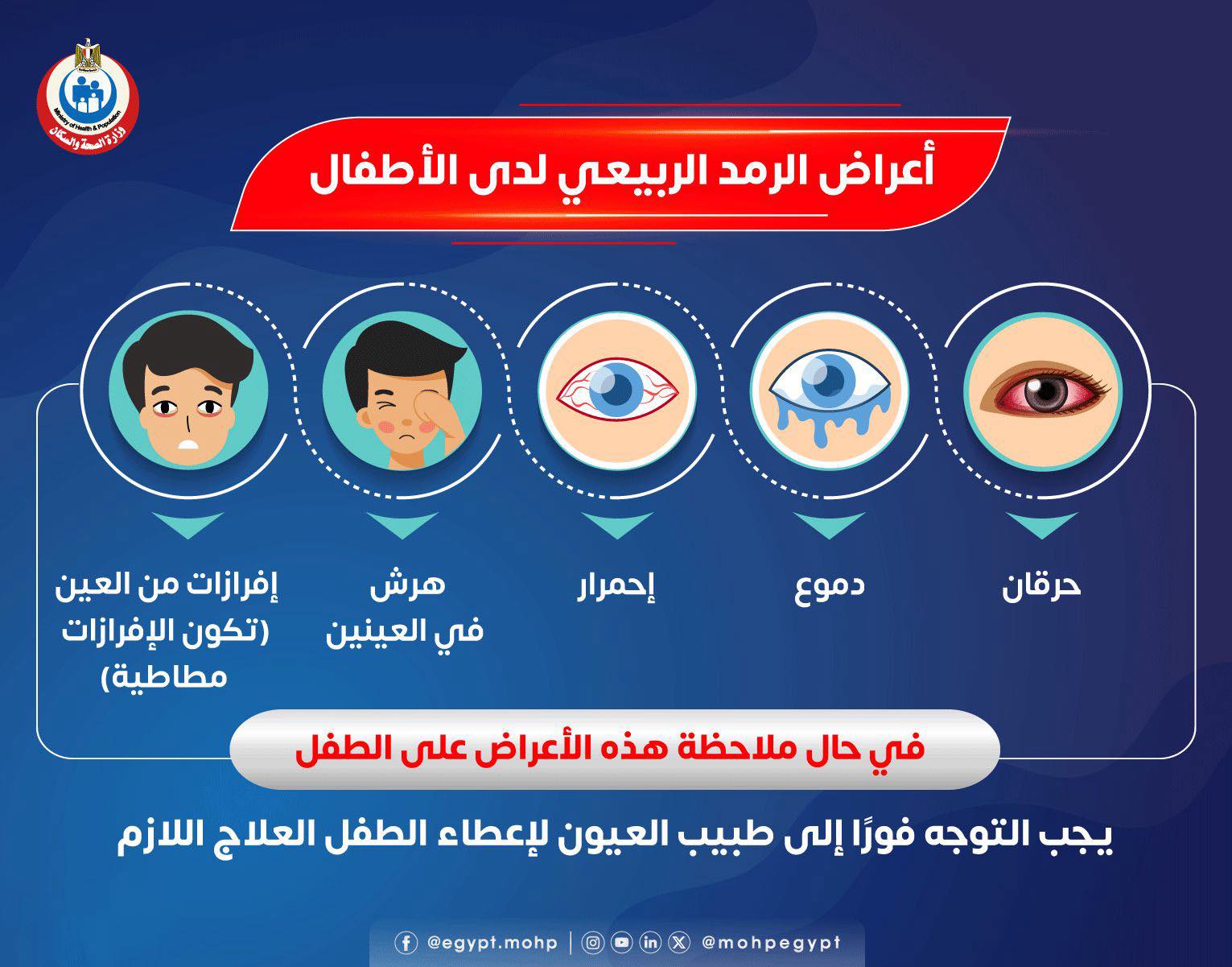 حذرت وزارة الصحة والسكان، من ظهور أعراض الربيعي على الأطفال، مشددة على الأسر ضرورة استشارة الطبيب في حالة ظهور هذه الأعراض لحماية الطفل من المضاعفات.