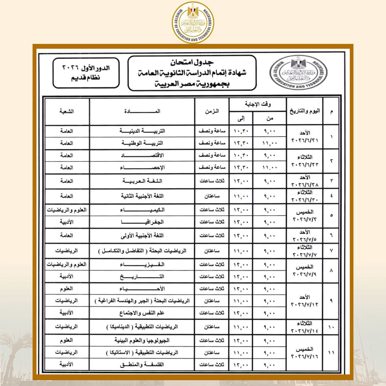 وتبدأ امتحانات الثانوية العامة للدور الأول (نظام جديد - نظام قديم) والمكفوفين يوم الأحد الموافق 21 يونيو 2026، وتستمر حتى يوم الخميس 17 يوليو 2026.