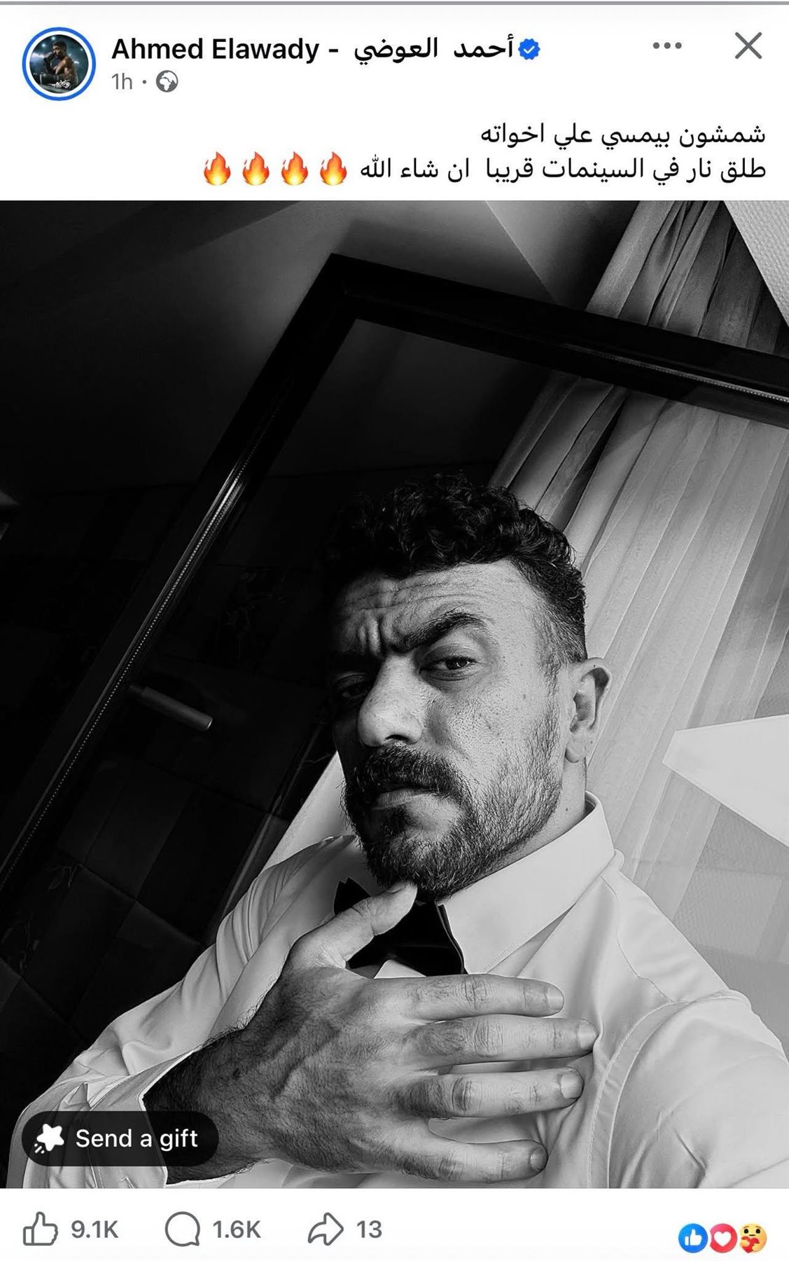ونشر العوضي، عبر حسابه الرسمي على موقع التواصل الاجتماعي "فيسبوك"، صورة له وعلق عليها كاتباً: "شمشون بيمسي علي اخواته.. طلق نار في السينمات قريبا ان شاء الله".