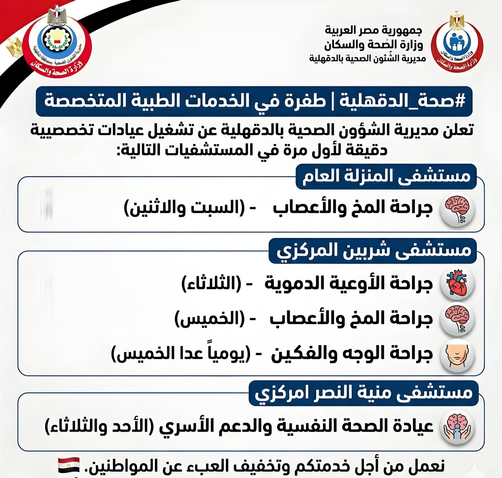 صحة الدقهلية تعلن تشغيل عيادات تخصصية جديدة بمستشفيات المنزلة ومنية النصر وشربين
