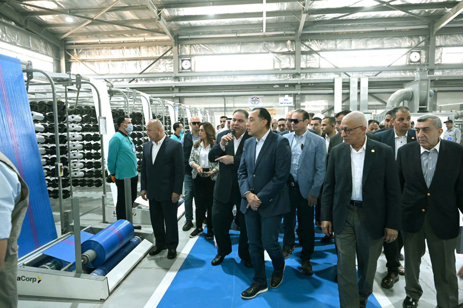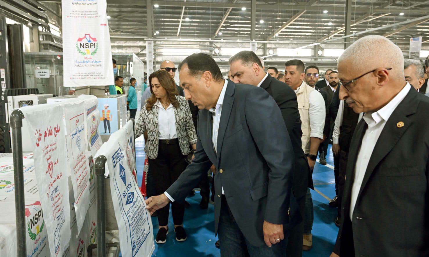 وعقب إزاحة الستار إيذاناً بالافتتاح، قام رئيس الوزراء ومرافقوه بجولة في المصنع، حيث استمع لشرح من اللواء إبراهيم عبد الجواد عجلان، الذي أوضح أن شركة سيناء الوطنية للصناعات البلاستيكية تم تأسيسها بنسبة مساهمة مصرية 100%، لتشغيل المصنع الخاص بانتاج المنتجات البلاستيكية بكافة أنواعها، موضحاً أنه فيما يخص مصنع الشكائر المنسوجة الذي سيتم تفقده اليوم فإنه يقام على مساحة 5200 م2 من مساحة المصنع، وتصل الطاقة الانتاجية له إلى نحو 55 مليون عبوة متنوعة سنوياً، لمختلف الاستخدامات، من شكائر الأسمنت والسكر والدقيق والأعلاف والملح ومنتجات أخرى، مضيفاً أن مصنع الشكائر المنسوجة يضم خطوط إنتاج مُتقدمة وحديثة تتضمن جميع مراحل انتاج الشكائر المنسوجة، وتم توريدها من إحدى الشركات الهندية المتخصصة في مجال تصنيع خطوط انتاج شكائر الأسمنت والجبس، والتي تقوم بتوريد خطوط الانتاج إلى مصر لأول مرة من خلال هذا المصنع.