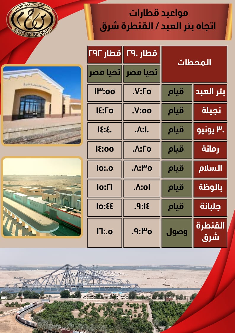 وأعلنت الهيئة تشغيل القطارات بالعربات المطورة تحيا مصر وفق جدول محدد حيث ينطلق قطار رقم 291 من محطة القنطرة شرق في تمام الساعة 08:00 صباحا ليصل إلى محطة بالوظة في الساعة 08:43 حيث يتقابل مع قطار 290 ثم يغادرها في الساعة 08:53 ليصل إلى بئر العبد في الساعة 10:10 صباحا كما ينطلق قطار رقم 293 من محطة القنطرة شرق في الساعة 14:30 ليصل إلى محطة بالوظة في الساعة 15:13 حيث يتقابل مع قطار 292 ثم يغادرها في الساعة 15:24 ليصل إلى بئر العبد في الساعة 16:40.