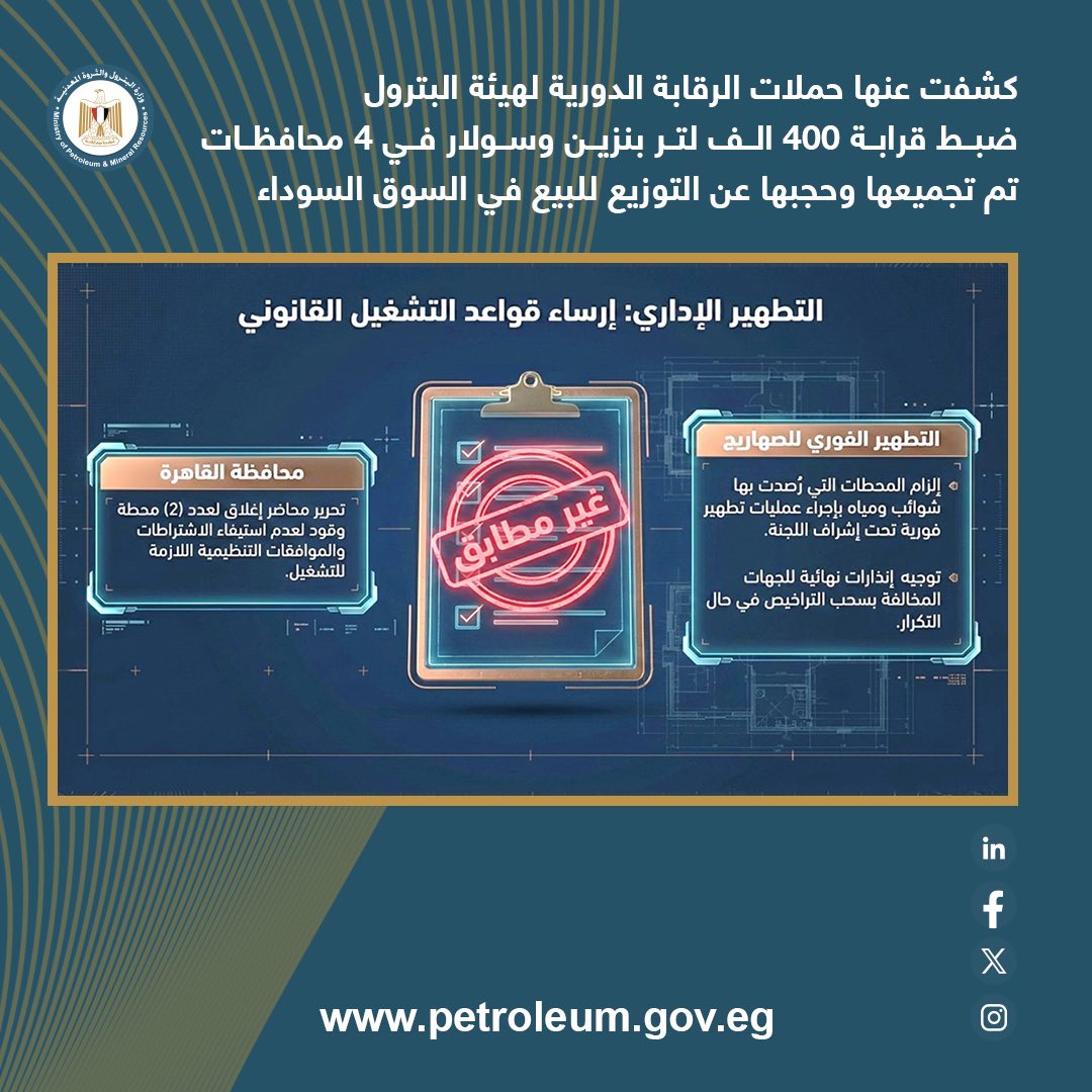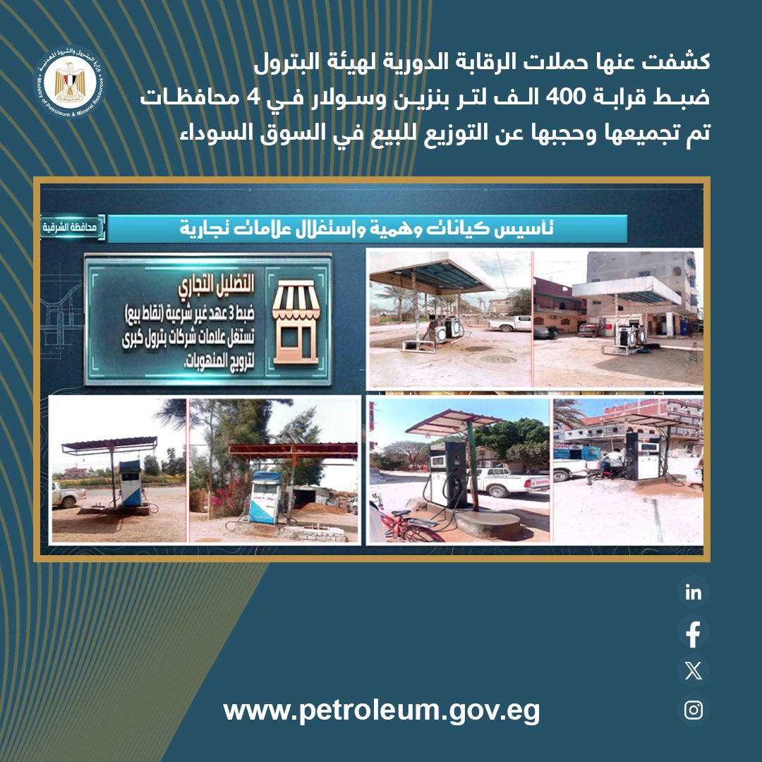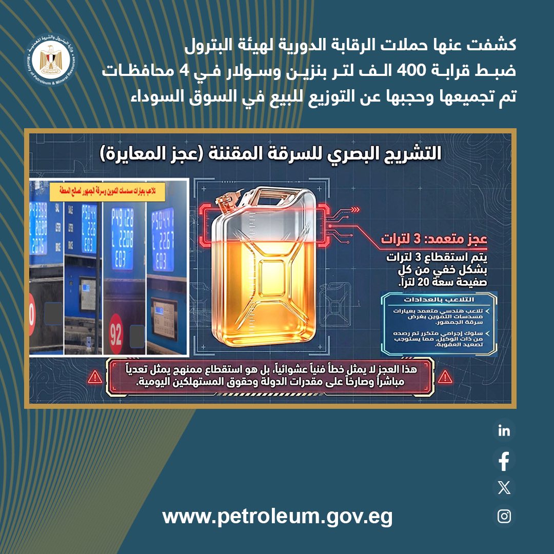 وقد أسفرت الحملات عن ضبط 396 ألف لتر من السولار والبنزين جرى التلاعب فيها بالمخالفة للقانون، بقيمة تقارب 16 مليون جنيه، في وقائع تمثل أعباءً على الدولة في ظل الأوضاع الراهنة بالشرق الأوسط وارتفاع أسعار الطاقة وتكلفة الاستيراد، وقد جري اتخاذ الإجراءات القانونية لتحصيلها كغرامات من المخالفين.