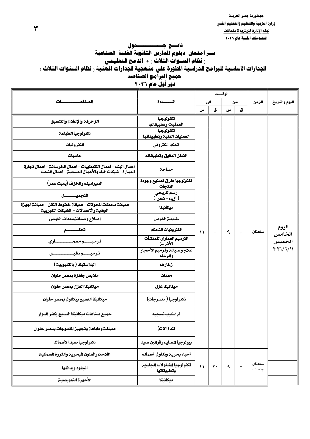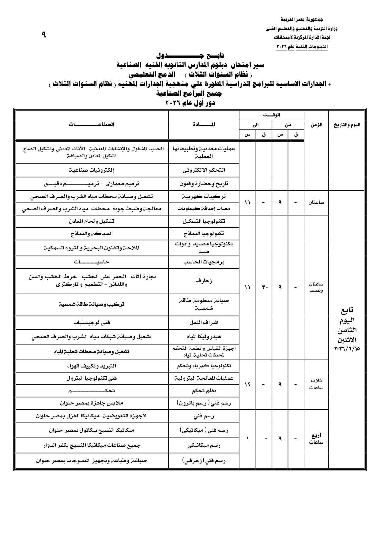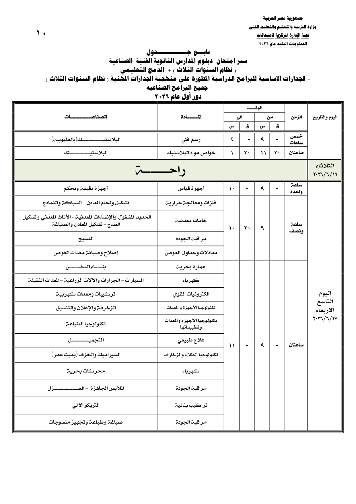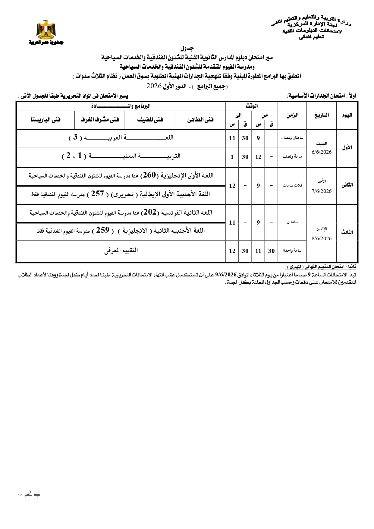 ومن المقرر أن تنطلق بداية امتحانات الدبلومات الفنية يوم السبت الموافق 6 يونيو 2026، وفقا للجداول المعلنة.