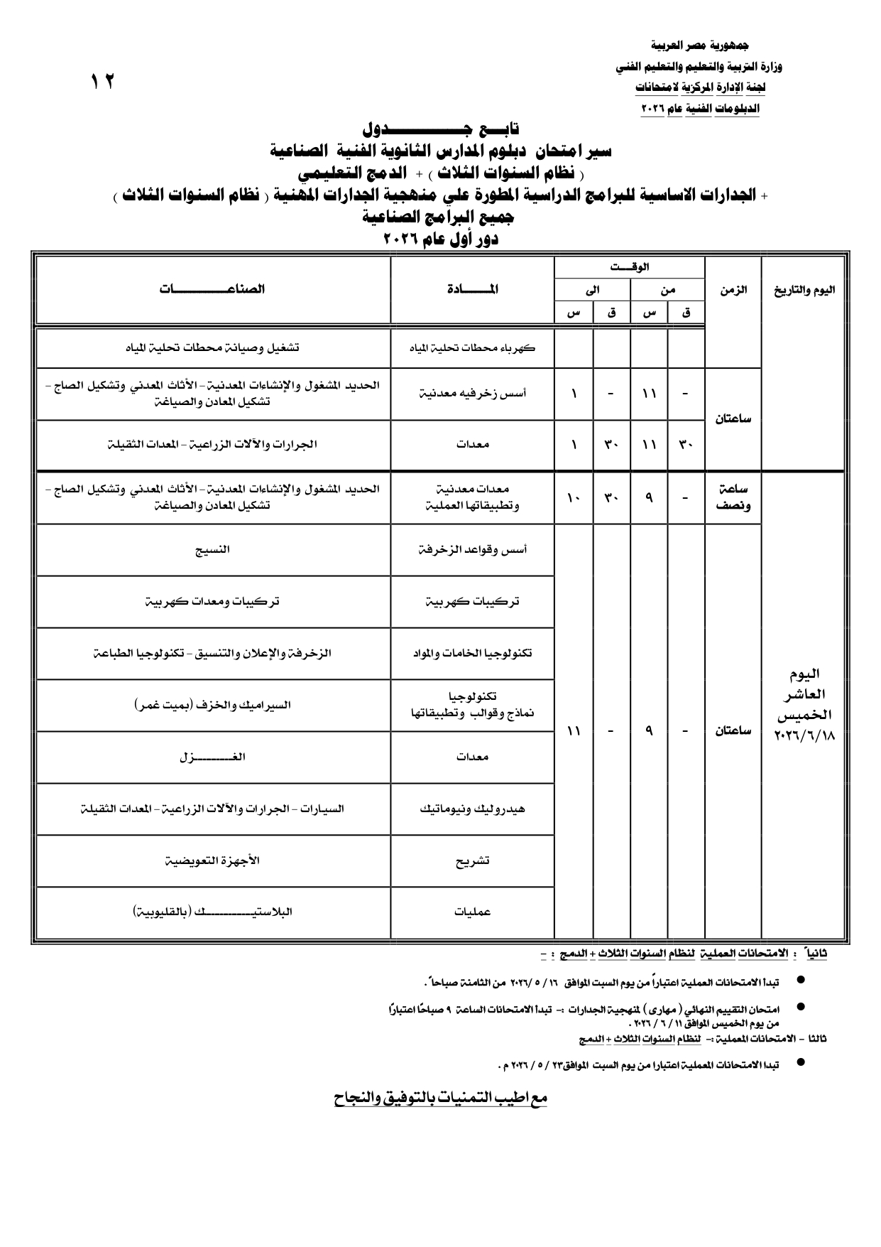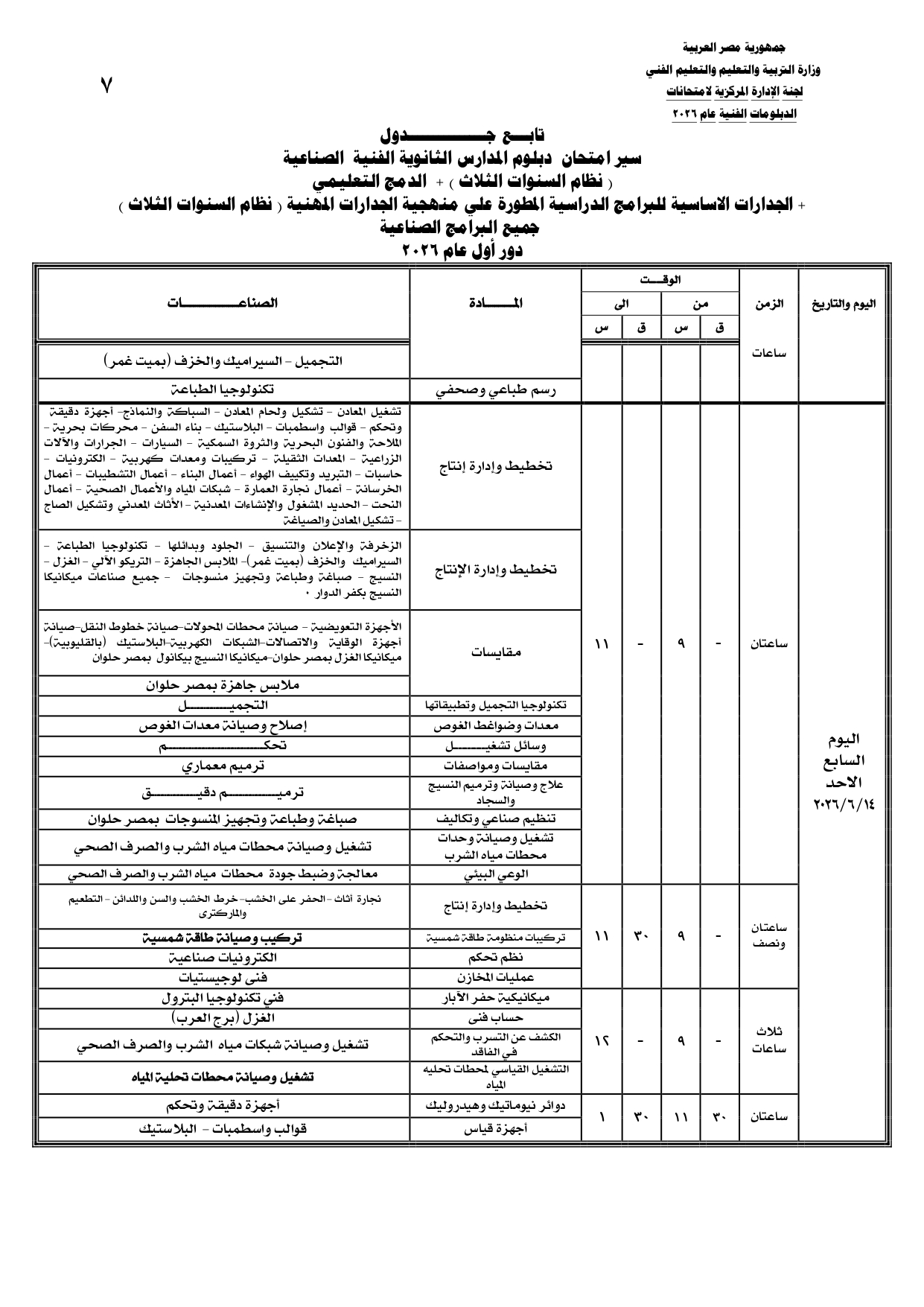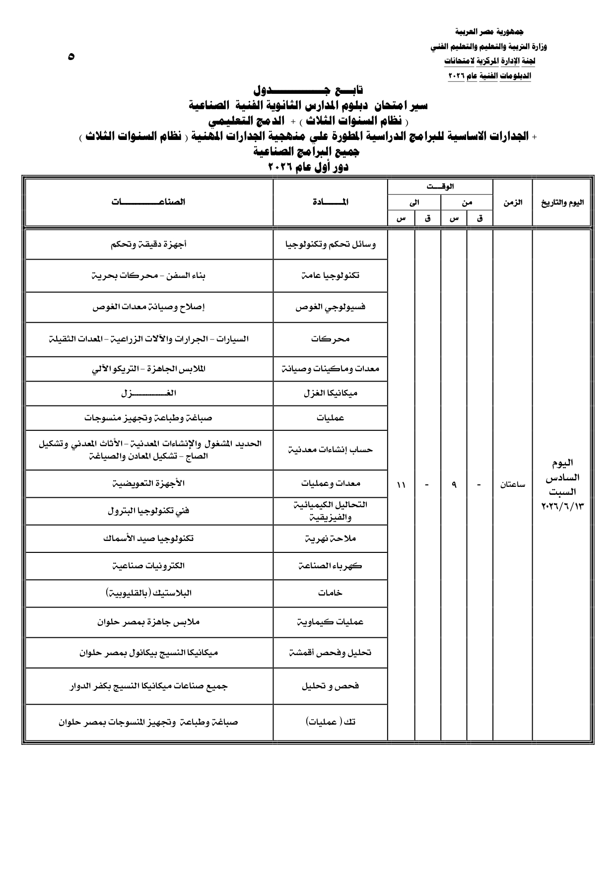 جداول امتحانات الدبلومات الفنية 2026