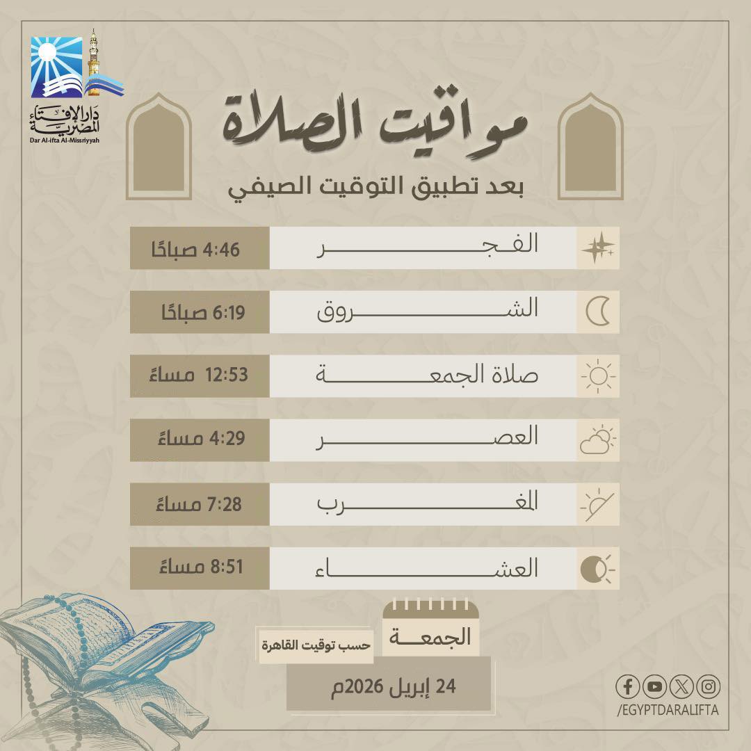 وتأتي مواقيت الصلاة في القاهرة، بعد تطبيق التوقيت الصيفي على النحو التالي: