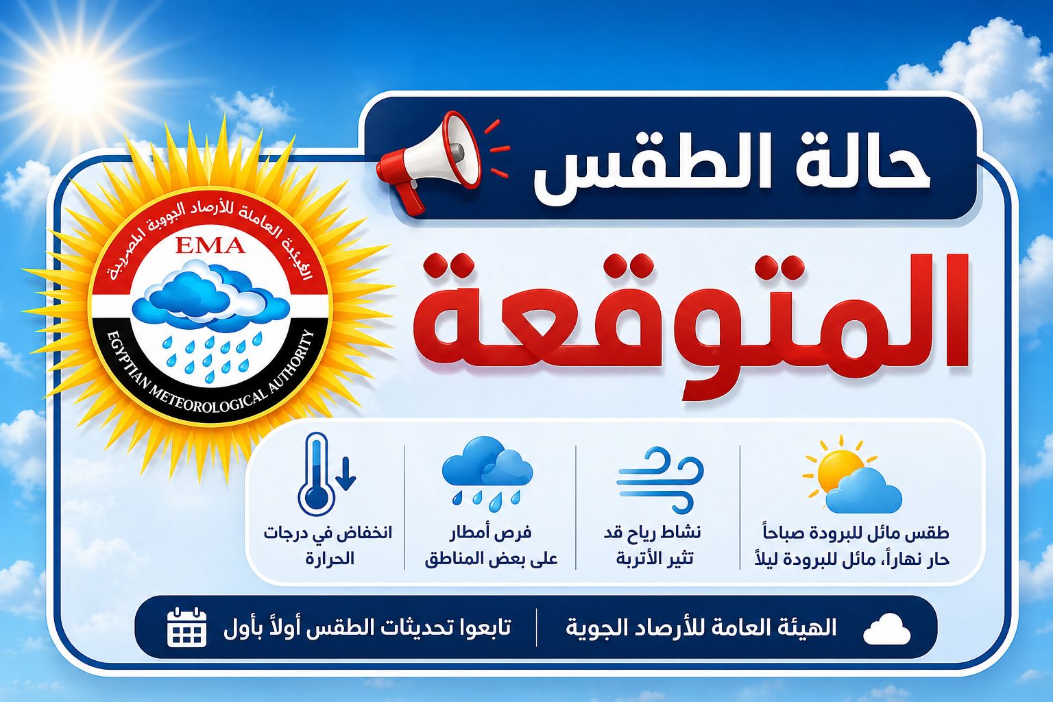 فضلًا عن فرص ضعيفة (بنسبة حدوث 20%) لأمطار خفيفة على مناطق من جنوب الوجه البحري ومدن القناة وقد تمتد للقاهرة الكبرى، ونشاط رياح تتراوح سرعتها من (30 – 40 كم/س) على أغلب الأنحاء️ قد تكون مثيرة للرمال والأتربة على السواحل الشمالية الغربية– الصحراء الغربية وعلى مناطق متفرقة من القاهرة الكبرى، الوجه البحري، مدن القناة، شمال الصعيد️، قد يصاحبها هبات رياح تصل إلى (45 – 55 كم/س)️ وقد تؤدي إلى انخفاض الرؤية الأفقية أحيانًا.