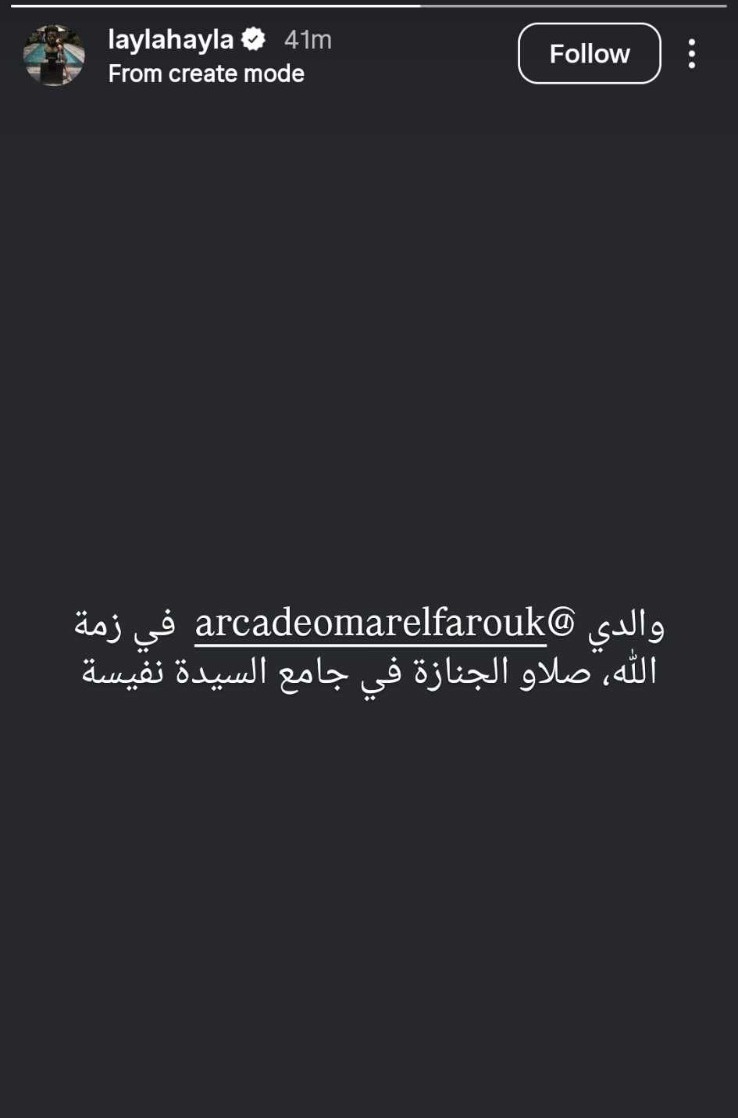 وكشفت ليلى الفاروق في منشورها أن صلاة الجنازة ستُقام في مسجد السيدة نفيسة، مطالبة جمهورها ومحبيها بالدعاء لوالدها بالرحمة والمغفرة، دون الكشف عن مزيد من التفاصيل المتعلقة بظروف الوفاة.