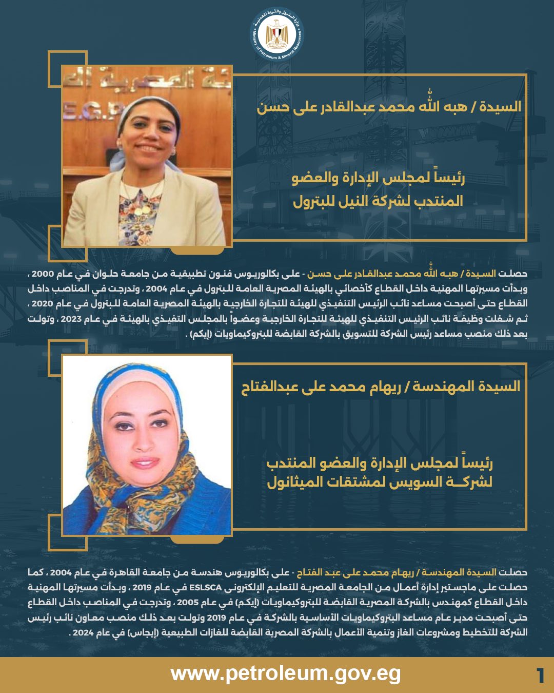 وشملت الحركة تكليف هبة الله محمد عبدالقادر برئاسة مجلس الإدارة والعضو المنتدب لشركة النيل للبترول، كما تم تكليف المهندسة ريهام محمد علي بمنصب رئيس مجلس الإدارة والعضو المنتدب لشركة السويس لمشتقات الميثانول.