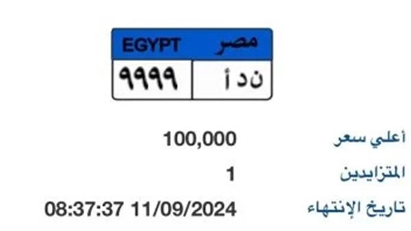 أرخص لوحة سيارة مميزة.. رقمها «ن د أ- 9999» وسعرها 100 ألف جنيه