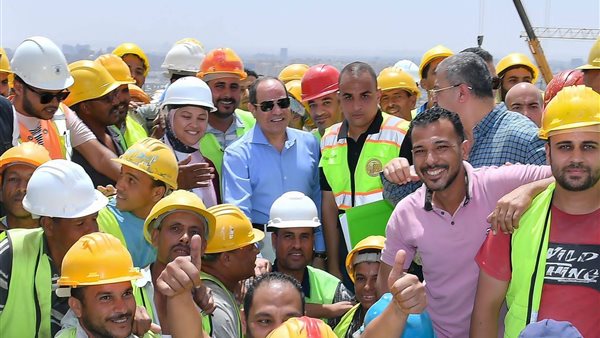 صورة تذكارية للرئيس السيسي وسط العمال والمهندسين خلال تفقده عددًا من الطرق والمحاور