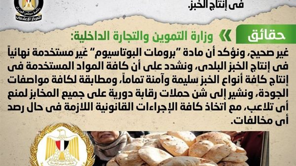 الحكومة تنفي شائعة استخدام «برومات البوتاسيوم» المسرطنة بإنتاج الخبز