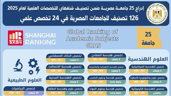 التعليم العالي: إدراج 25 جامعة مصرية ضمن تصنيف شنغهاي للتخصصات العلمية لعام 2025