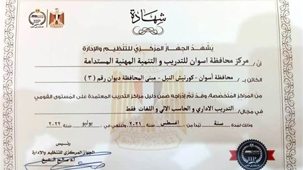 اعتماد مركز محافظة أسوان للتدريب والتنمية على مستوى إقليم جنوب الصعيد