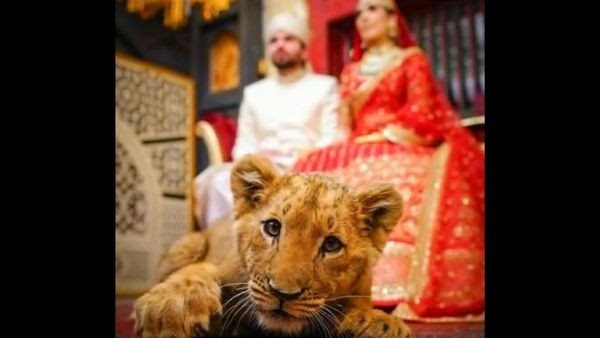 شاهد.. جلسة تصوير من حفل زفاف بجوار أسد تثير الجدل على السوشيال ميديا