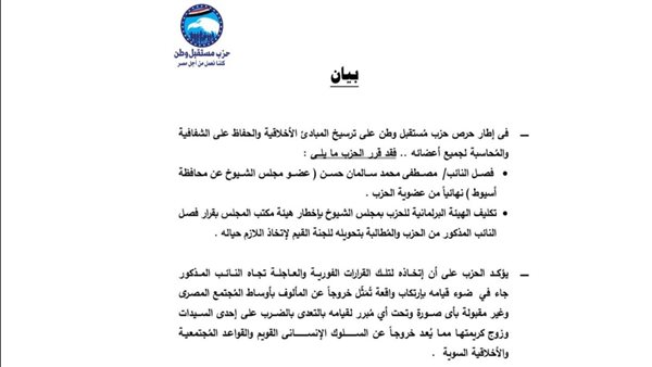حزب مستقبل وطن يرفض تجاوزات أحد نوابه ويصدر قرارا بفصله