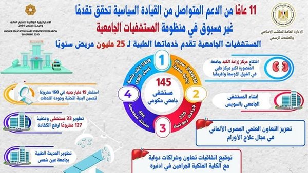 11 عامًا من الدعم المتواصل من القيادة السياسية لملف المستشفيات الجامعية