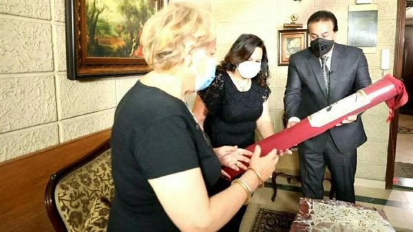 رئيس جامعة بني سويف يسلم هدية الرئيس السيسي لأسرة شهيدة القطاع الطبي