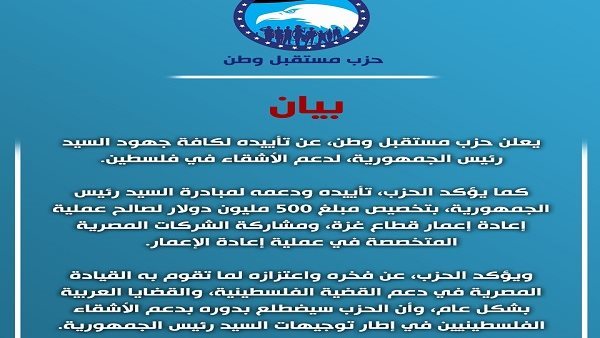 حزب مستقبل وطن يثمن كافة جهود الرئيس السيسي لدعم الأشقاء الفلسطينيين