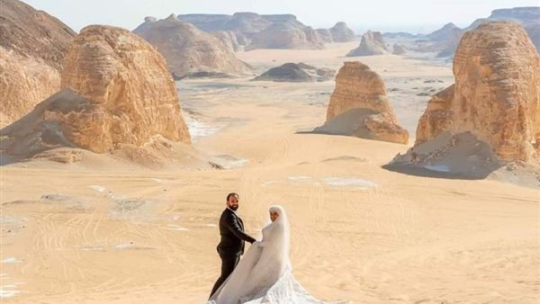 بالصور.. سيشن تصوير لعروسين في الصحراء البيضاء بالوادي الجديد