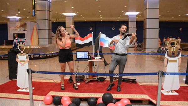 بالزي الفرعوني والورود.. مطار الغردقة يستقبل سائحين روس «صور»