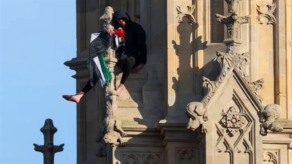 عاجل|بعد 17 ساعة.. متسلق «بيج بن» ينزل من البرج رافعا علم فلسطين.. فيديو