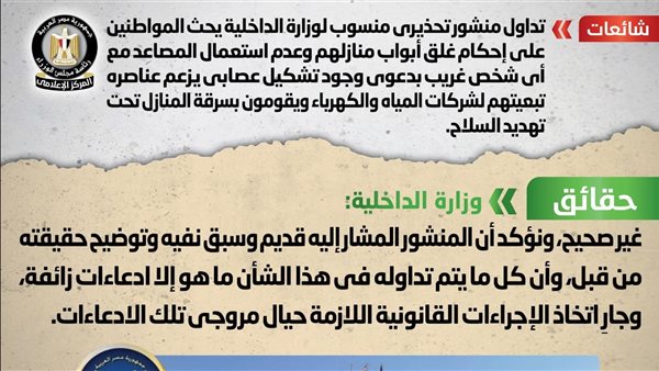 الحكومة: التحذير المتداول عن وزارة الداخلية بشأن احكام غلق أبواب الشقق واستخدام المصاعد غير حقيقى