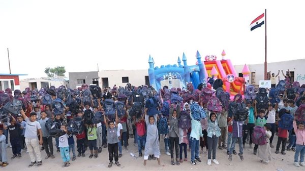 قوافل السعادة.. توزيع شنط مدرسية وأدوات كتابية على أطفال شمال سيناء