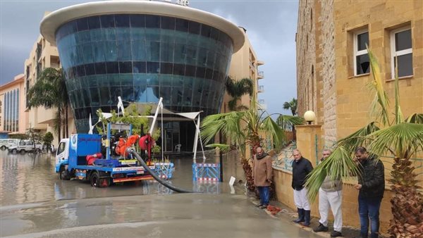 جهود مكثفة لإزالة تجمعات مياه الأمطار في مطروح.. صور