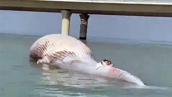 انتشال حوت نافق بحجم شاحنة من البحر في الكويت (فيديو)