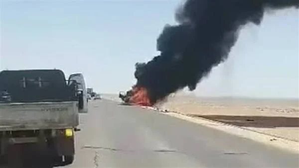 تفحم سيارة اشتعلت بها النيران على الطريق الأوسطي بالبدرشين