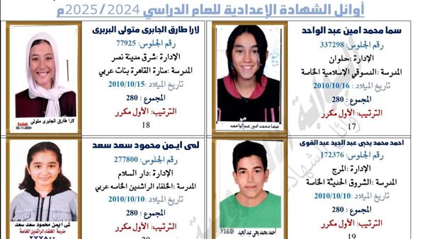 ننشر أسماء أوائل الشهادة الإعدادية في القاهرة.. حصلوا على الدرجات النهائية 280 درجة