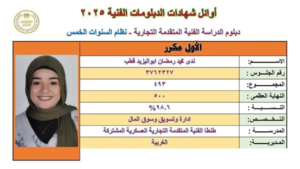 ندى محمد الأولى مكرر في الدبلومات الفنية: دعم أسرتي سر تفوقي