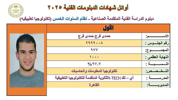 الأول في تكنولوجيا المعلومات بالدبلومات الفنية: «مكنتش متوقع أكون من الأوائل.. ووالدي كان سندي»