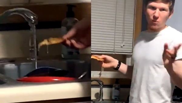 رجل يستخدم طريقة غريبة لتبريد البيتزا الساخنة.. شاهد